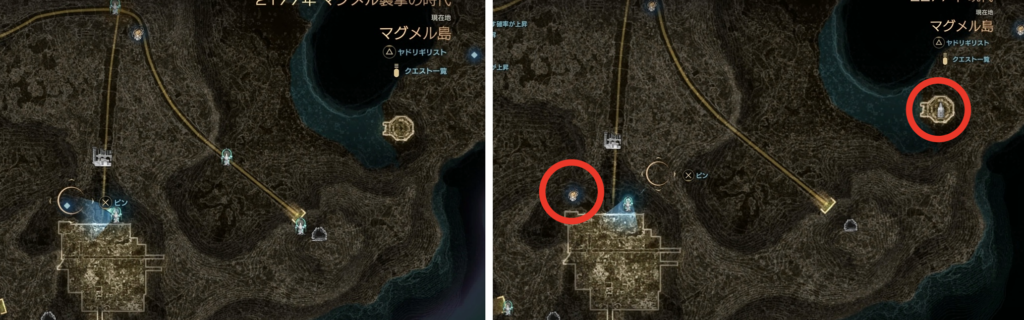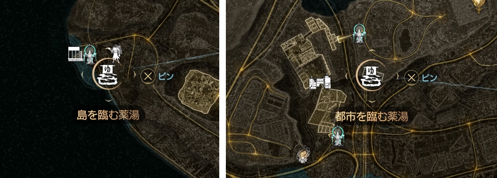 マグメル内にある温泉、水没都市に2つ、屍人の森に2つ、酸の谷に1つです。