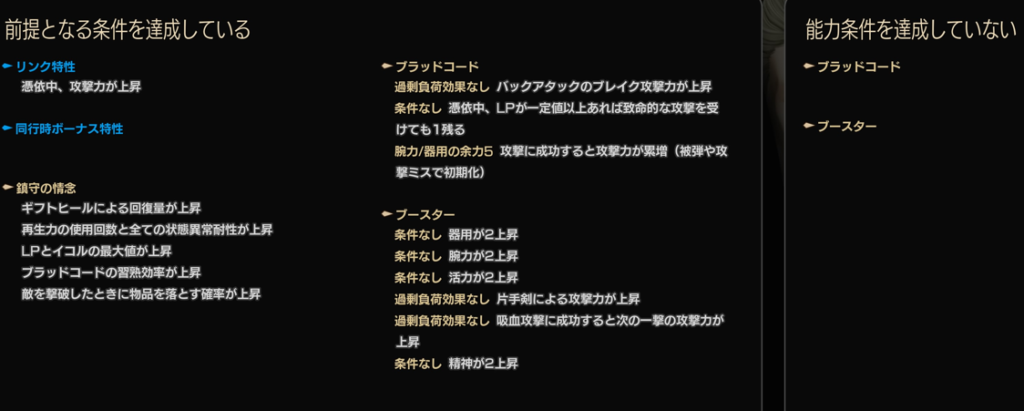 はじめて条件付き特性を発生させたがトロフィー取得条件です。正確な条件がわかっていないのですが、おそらくブラッドコードやブースターについている特性を発動させることと思います。意識しないでもブラッドコードや装備を付け替えたりしていると自然と獲得できると思います。